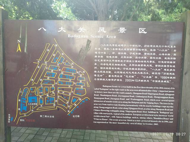八大关,是我不能忘怀的, 那宁静,清秀,翠绿,条条绿道,满郁情意,纵横交错,十字阵型,和谐八关,构造古典建筑与美丽海岸线统一。下车后,同样的路面,同样的坡度,同样的远方,想起我跳跃的画面,无一不印证我当年的历程,再次,两次,三次跳跃,极好。和孩子讲起。清晨的八大关,人稀景美,空气弥漫清新味道,到处都是绿意,全身被色彩包围,掩映在清翠之中,森林公园之中。从任何路走,建筑与人与景相和谐,走到海边就是花石楼,也就是青岛第二海水浴场。坐落环境相当优越,周围绿树成荫花鸟鱼虫,在家中就可以完美欣赏海上生明月之景。“花石楼”是青岛八大关景区中的一个标志性建筑,这是一座西欧古典城堡建筑,它具有旋转式露台、哥特式塔尖、拜占庭式的门廊、组合主体是巴洛克式的建筑,格调与文化拼在一起集中式建筑。外观青石铺设古典雅致大气澎湃,圆柱形城堡塔身独树一帜。花石楼从造型上共有五层,地下一层、地上三层、塔楼到五层,每一层都有一个主题:一层是会客厅、餐厅,二层是卧室,三层是咖啡室和书房。只开放三个楼层,每层通过雕饰镂空窗户,阳光空气漫射下来,远望海天一色,平静如止,波涛汹涌,仙气朦胧。而公主楼则活泼可爱,青春靓丽,色彩斑斓,绿身红顶,映照八大关精美之绝。公主楼对面就是西班牙风情馆,此馆以前没有开放,反映西班牙人豪迈,爽朗,气魄,智慧。舞蹈,音乐,吉他,斗牛胜斗士,极具欧洲纯正血统。在第二浴场痛快泡泡海澡,浑身上下透露健康之气。