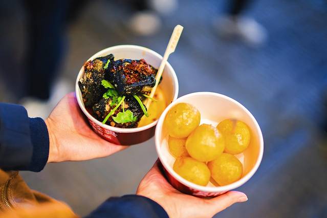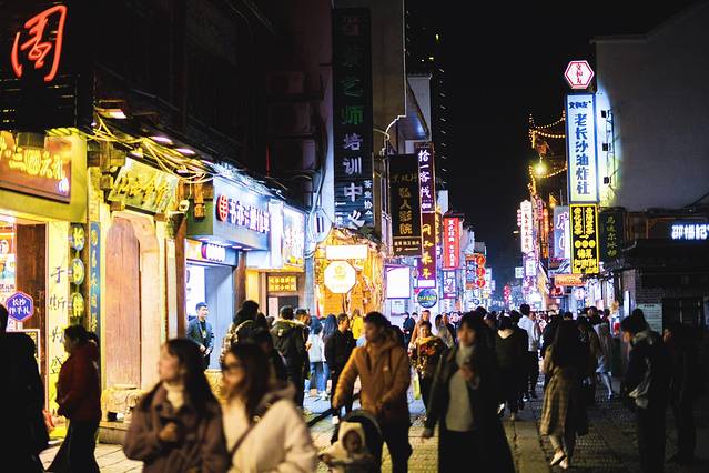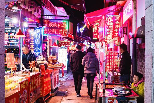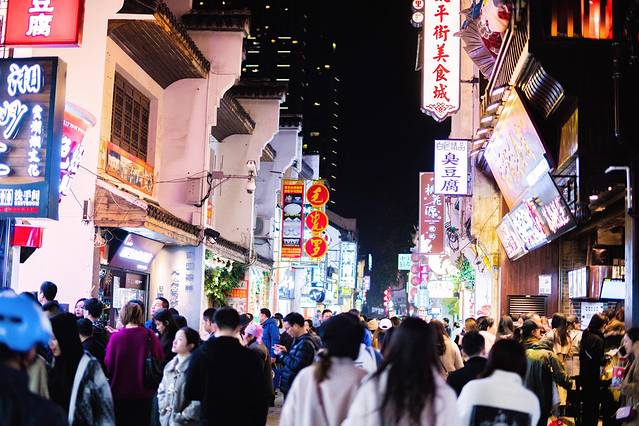 大晚上来这里当然是为了吃啊,虽然昨天的炊烟时代小炒黄牛肉至今令我难以忘怀!但黑色经典臭豆的诱惑就是这么突如其来,黑色的臭豆腐涂上一层酱料,咬一口油酥香辣,味道棒棒哒!文和友大香肠,真材实料外焦里嫩,裹上一层辣椒粉,对肉食动物来说太对胃口了。糖油粑粑,外面炸的脆脆的,里面是Q软的糯米团,一口一个,吃多了有点腻。半仙豆夫,继茶颜悦色后第二家长沙必喝饮品,挨个打卡,好过瘾
