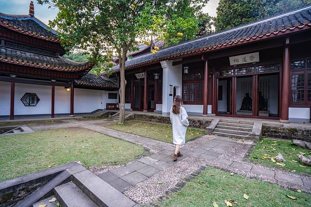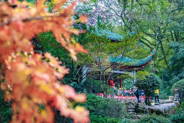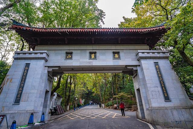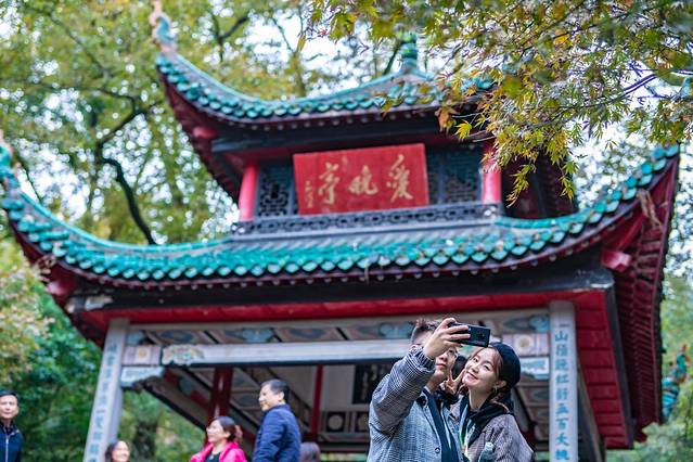 “停车坐爱枫林晚,霜叶红于二月花”,由诗得名的爱晚亭就在岳麓书院后面清风峡中,民国时期,在长沙传播革命种子的毛主席和杨开慧相爱,两个人经常结伴来爱晚亭谈心(恋爱)。亭子上红底鎏金匾额“爱晚亭”三字是建国后重建时毛主席题写的。