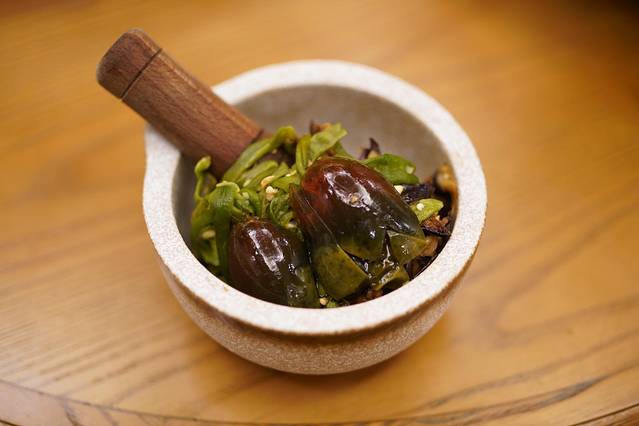 要用捣蒜锤把皮蛋辣椒和茄子一起捣开,好好玩儿,开胃神器。爽口的皮蛋、软趴的茄子,搭配辣椒,三合一体,完美融合,绵密又不失清爽,吃的够味,超级下饭! 辣度:🌶️🌶️