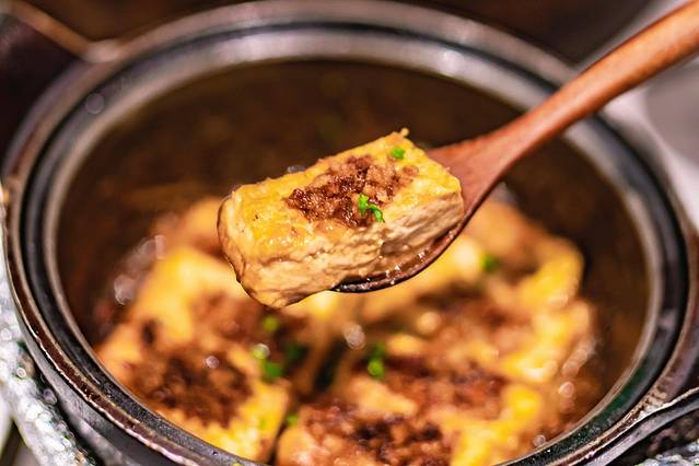 豆腐表面煎的金黄,外表香脆,内里嫩滑,再加上豆腐中间由瘦肉、虾仁🦐、胡萝卜🥕制成的小肉丸,吃起来口感层次相当丰富。能把豆腐做的这么鲜美多汁,不愧是菜单四大经典菜品之一。