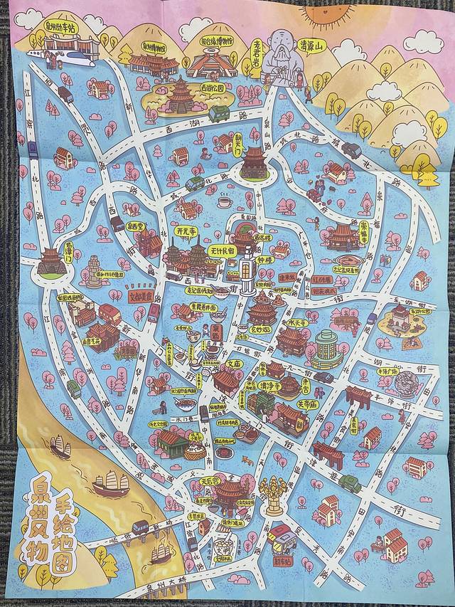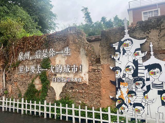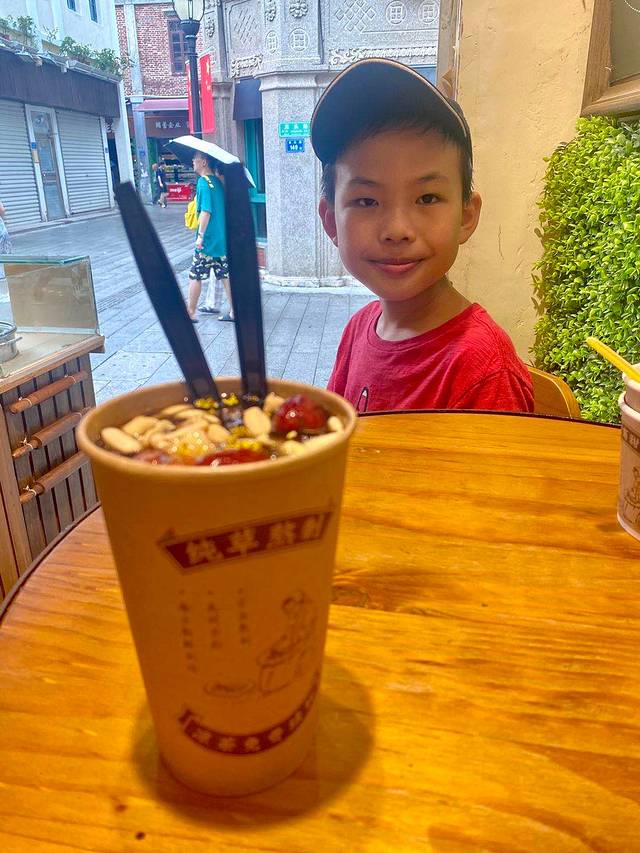 民宿的小哥给了我们一幅泉州手绘地图,按着地图打卡吧。民宿就在老街,往西街的路上会经过小西埕,在一面斑驳的旧墙上写着“泉州,这是你一生至少要去一次的城市!--白岩松(小西埕)”,里面开了些特色的店铺,怀旧市集,玩偶手办,撸猫馆之类的,因为疫情的缘故吧,人不多,有些店铺也没开,有一个很大的许愿走廊挂满了各种许愿牌,写一个5元,我在走廊里看了一会儿,“成长的道路很艰难,但白月光一直陪你成长”,“希望余景天C位出道”,“今夕何夕,见此良人,青山不老,与君白头”,还有很多的“平安喜乐”,买一个许愿牌,写上一句话,挂上去,渐渐的也就成了一个风景。从小西埕穿出去就到了西街,西街就像所有旅游城市的商业步行街一样,卖着各种当地的小吃和全国雷同的纪念品。选了一家店吃了面线糊和四果汤,店里的店员操着一口的四川话,门口挂着泉州小吃老字号的招牌,店员说老板是本地人,好吧,总觉得不是本地人做的,味道没那么正宗。面线糊是这边特色小吃,里面的面细细的像线一样,煮好了是半透明的,汤头里面可以加虾仁、醋肉,牡蛎仔,淡菜之类的。四果汤几乎每天都会吃一碗,小朋友很喜欢,各种水果切成小丁,加上芋圆或者烧仙草冻之类的,调成一碗冰糖水,底料都是一样的,你可以随意选四种水果配,所以叫四果汤。