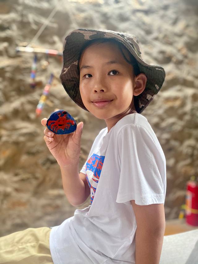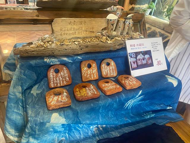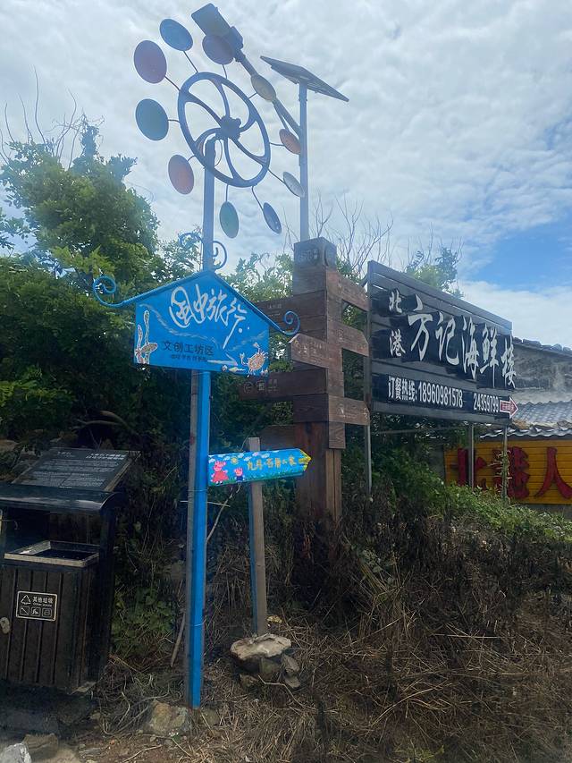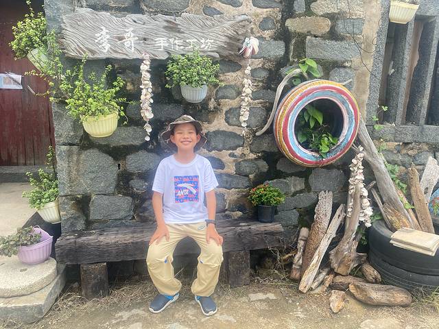 吃过早饭,我们今天的第一站是北港,北港据说是拍过爸爸去哪儿的取景地,不过我没看过,北港村不大,房子都是依山傍海建的石厝, “建了些咖啡馆,饭馆和民宿,“石头会唱歌”,“风中旅行”算是比较有特色的,因为是淡季,所以岛上的人不多。有些台湾人在这里提倡共生文化,卖手作,开了民宿和餐厅,也做体验和夏令营之类的,孩子们不去上学,自己在圈子里自学,不学习的时候帮忙做事情,向导、服务员什么的。老板很自豪的讲解了他们的共生,说他们这个团体在一起已经20年了,“软弱在现实的世界,是自己的事;在共生的国度,却是大家的机会”,“忍耐是孕育执着是创作”,“不要依靠别人,不要依靠自己,要依靠活下去的一口气和现在的学习”“,”不为成功,只为人生精彩”,很高兴看到一种不同的生活理念,希望他们实现自己的梦想。在一家小店里,吃到了当地的特色小吃四果汤,他家的四果汤是浇在冰沙上的,比之前吃的冰糖水更加冰爽,另外一种叫做“时来运转”的特别小吃,这是平潭岛特有的当地美食。看上去是小小圆圆的一个,馅料里却有丰富的蔬菜和海蛎等海鲜,吃起来糯糯的口感,别具一番风味,有点像江浙一带做的糯米团子,蒸着吃的。沿着村子里的路走走逛逛,有些特色的咖啡小店,石头会唱歌,风中旅行和老柴咖啡都不错,手冲的咖啡哪里都差不多,特色的是有一款蓝眼泪的饮品,颜色做的很是梦幻,蓝盈盈的非常好看。可以坐在露台上吹着海风看海景,海鲜就不推荐了,靠海吃海,也都差不多,有家方记海鲜楼靠在里面山上的人比较多。村子不大半小时逛了一圈,有沙滩可以玩沙子,就是中午太晒了,吃好中饭,继续泡咖啡馆,石头会唱歌门口放了他们从山上捡回来有音阶的石头,按照顺序敲击可以敲出一首小星星,小朋友在哪里敲了一会儿。下午有个节目是画石头画,挑选略扁一些的石头用颜料画成自己喜欢的图画,吹干了可以带回家。小朋友照例画了自己最擅长的螃蟹,还画了一个西瓜,我画了一颗树(呵呵,3块石头1斤多了)当作纪念品背回来。在北港晃到下午4、5点,太阳下山的时候我们去风车田赶海,这边赶海就是等退潮了去沙滩上捉小螃蟹、贝壳之类的。风车田那边有一大片滩涂,赶海的人挺多的,很多石头都被翻了N遍,不过我们还是翻到了很多小螃蟹,小朋友们带着小铲子小桶,一个个挖的不亦乐乎。螃蟹和螺是捡的最多的,偶尔还能捉住几条小鱼。赶海结束,又返回到北港吃晚餐。