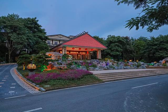 从广州市区出发,大约一个半小时车程可以达到,我们中午到达后,直接入住森波拉度假酒店,酒店是坐落于“山腰”上、“隐藏”在众多大树荫下的一座低层建筑,酒店正门前是个人工假山和流水,池里面还养着各色各样的金鱼,小朋友很喜欢在这里看鱼!