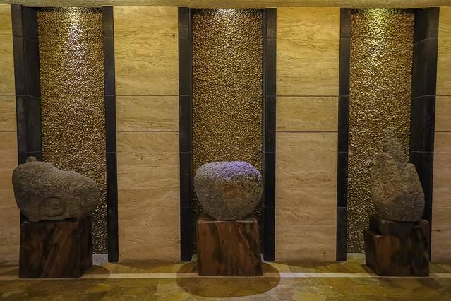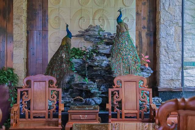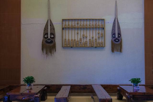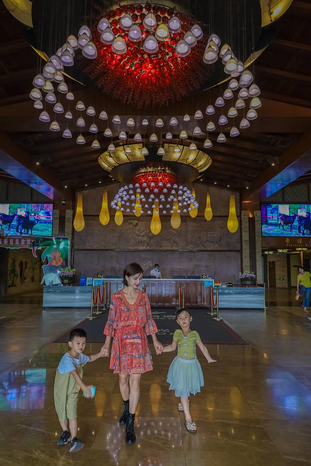 酒店大堂古色古香而又不失豪华高贵,宽敞而明亮,火山岩上精美的桫椤图腾、羊角造型的乳白色陶雕壁饰、黄中带黑的古船木接待前台和休憩座椅,一石一木间充满着古朴的气息,都在向您展现最远古的自然风韵。两个娃就喜欢在这大堂里追逐打闹!