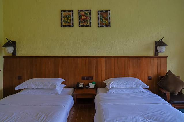 酒店房间沿袭了大堂的风格,同样带着点古风设计,简约而不简单,房间不算大,但是给人感觉就是干净清爽整齐,由于带着两个娃,我们入住的是带有双床的标间,床铺是榻榻米式的设计,俩娃第一次住这种榻榻米式的床铺,很兴奋,尤其喜欢在两个床中间这块床板上坐着看电视。