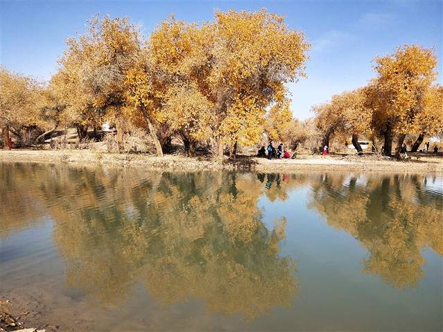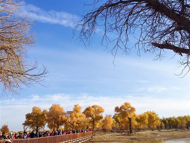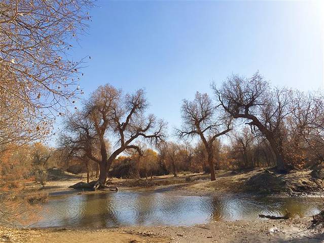 二道桥(倒影林)充满原始风味,水道宽阔,是胡杨林景区刚进门的位置,额济纳河两岸婀娜挺拔的胡杨树,树叶在秋天呈现美丽的金黄色。在河上的倒影,看了让人觉得如梦如幻,美不胜收