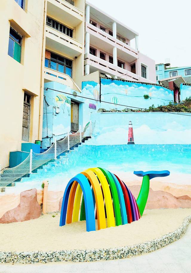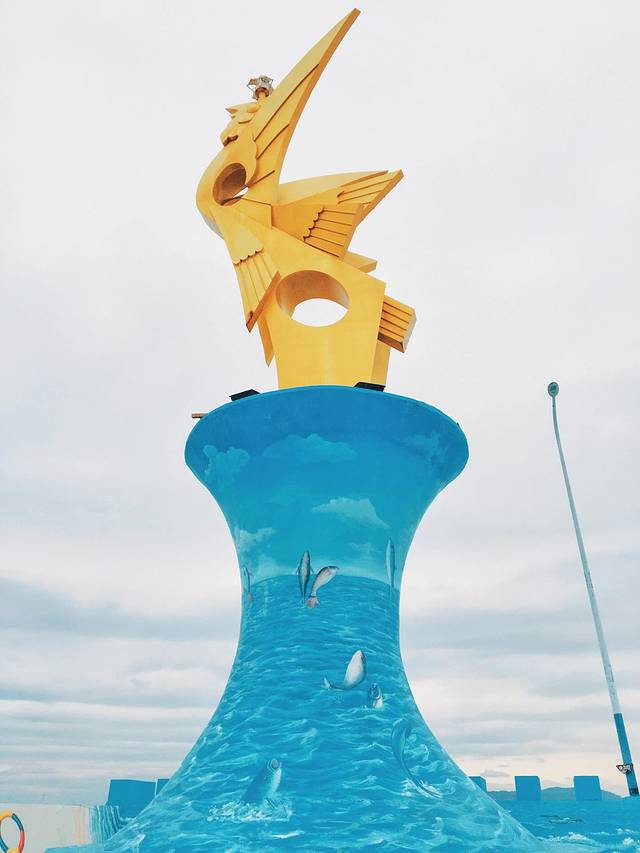 手绘的海虹堤坝,与蓝天白云融为一体,金鸡雕像也可以融入其中。