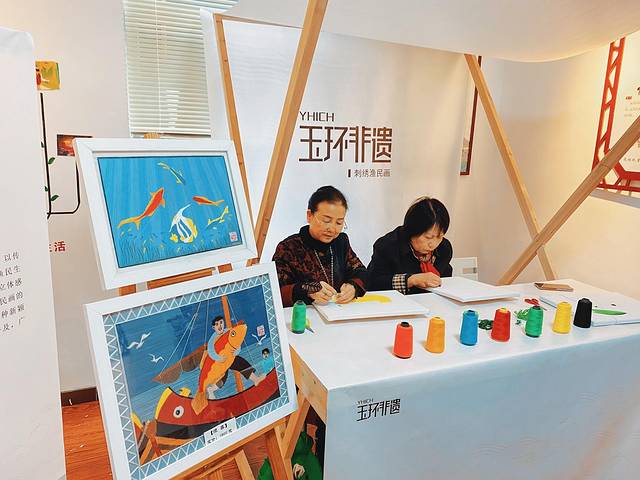 垟根村文化礼堂内,有非物质文化展示,匠人们现场演绎,火山茶制作,鱼龙灯,刺绣渔民画,竹编,门神画,玉环鼓词等等...