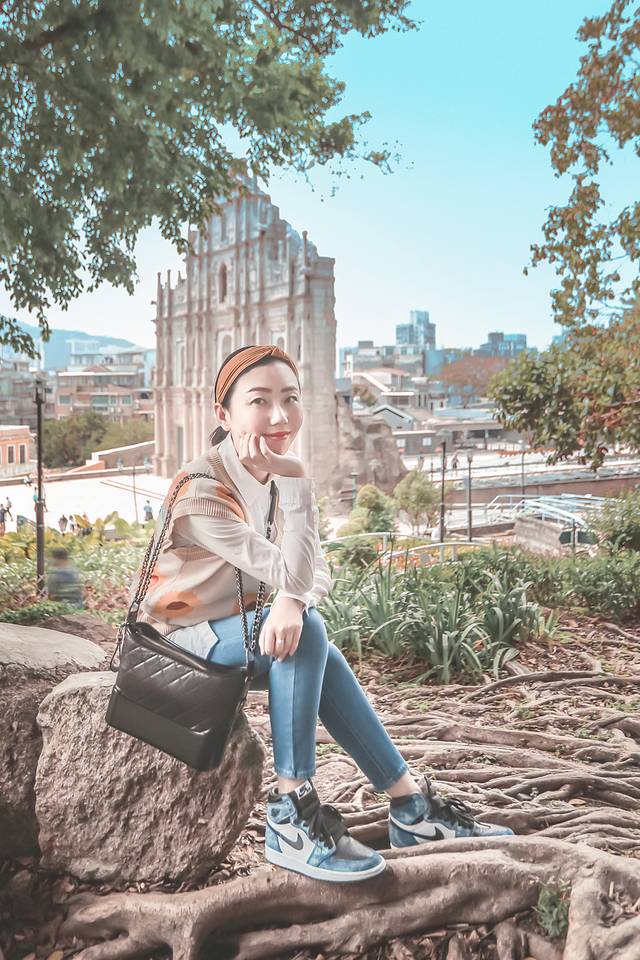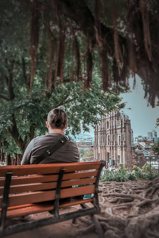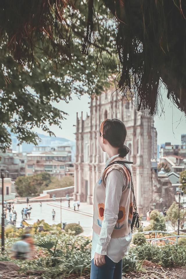 可以站在树下拍,也可以坐在树根上拍,还可以坐在旁边的长椅上。树下还有几块石头,坐在上面拍也不错。脸朝向大三巴牌坊,拍摄看着大三巴牌坊的照片,会更有意境哦~