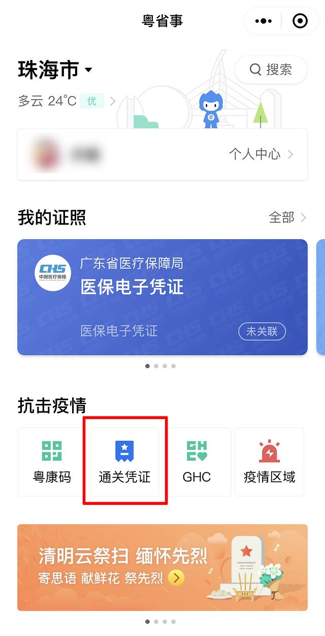 进入到粤省事XCX,点击通关凭证,进入到粤港澳通关页面。