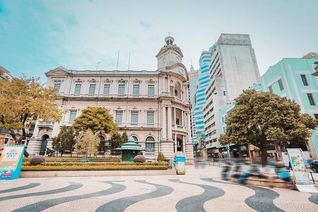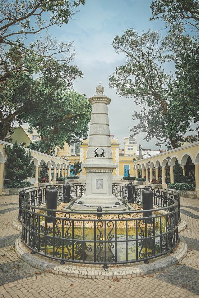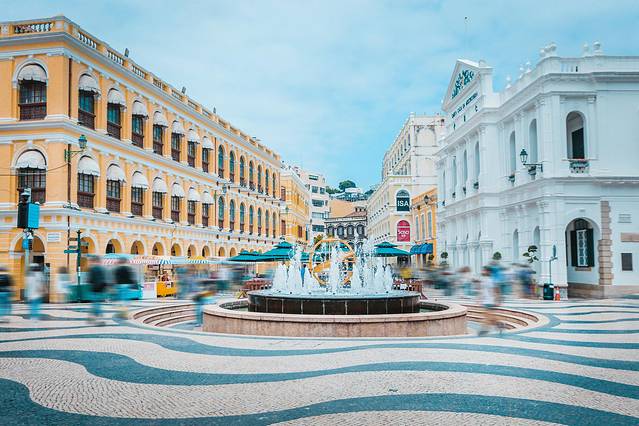 广场呈狭长的三角形,四周坐落多座百年历史的葡式老建筑,黑白相间的波浪地面和中央的喷水池更添南欧风情。