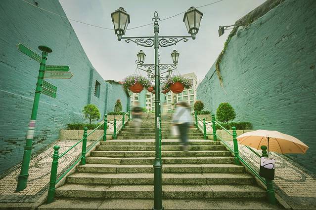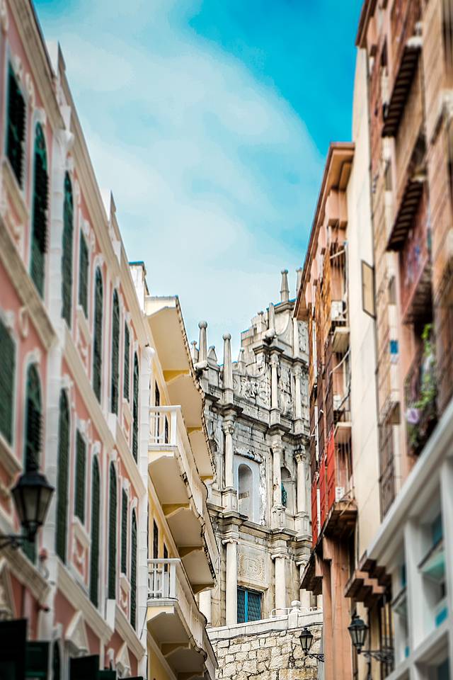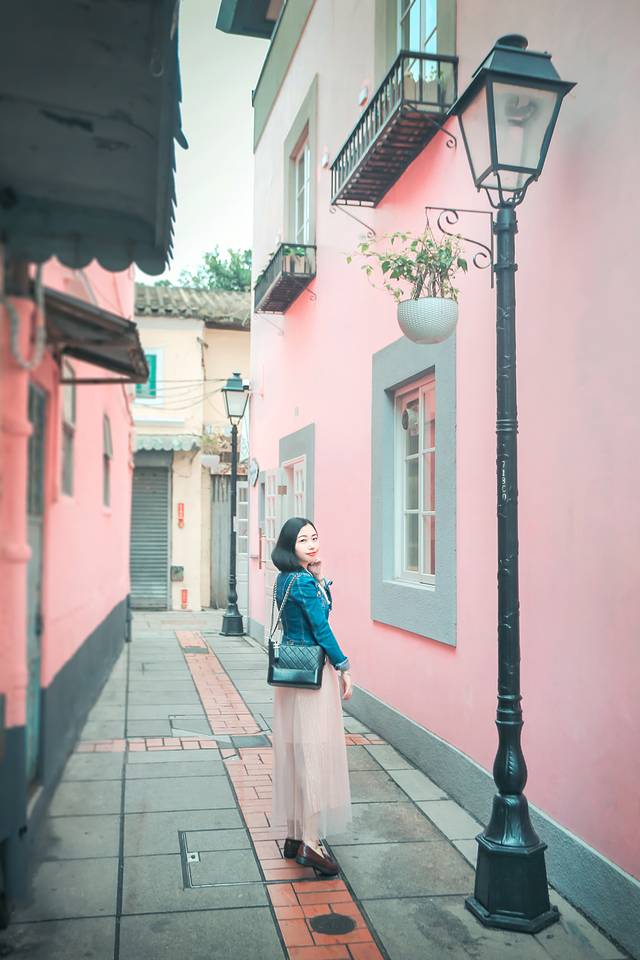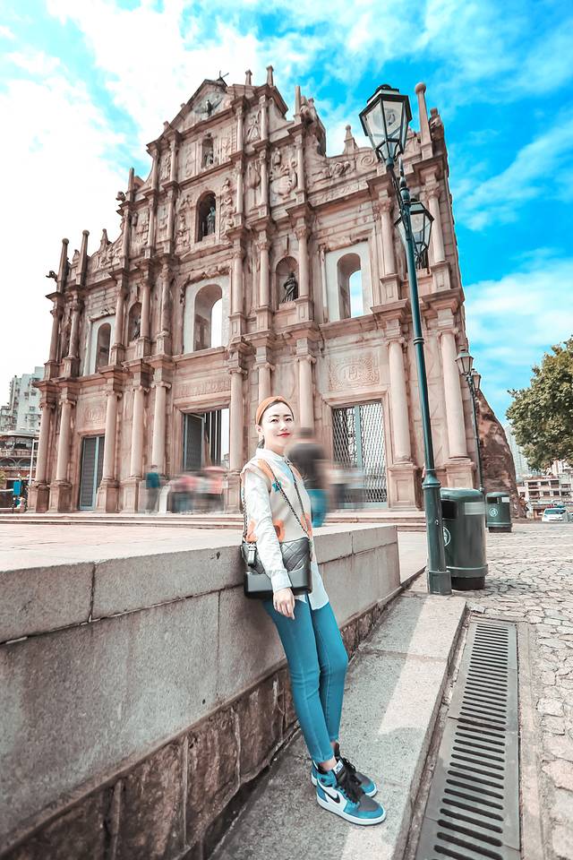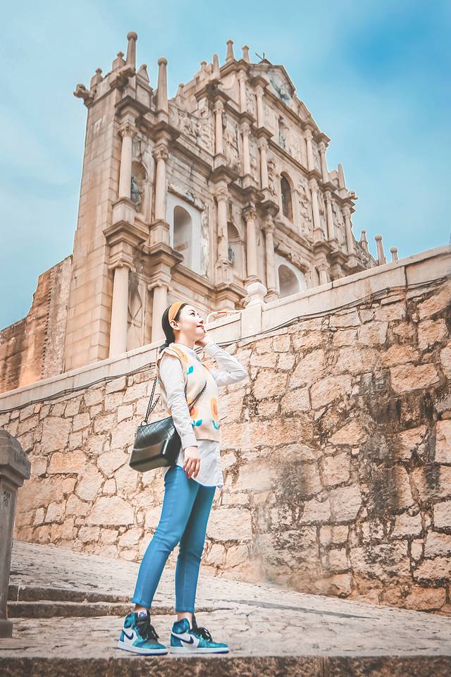 恋爱巷位于大三巴街和大三巴右街之间,这里也是拍摄大三巴牌坊的绝佳机位。站在石阶上仰拍,既可以拍出牌坊的高大,又可以拍出大长腿。
