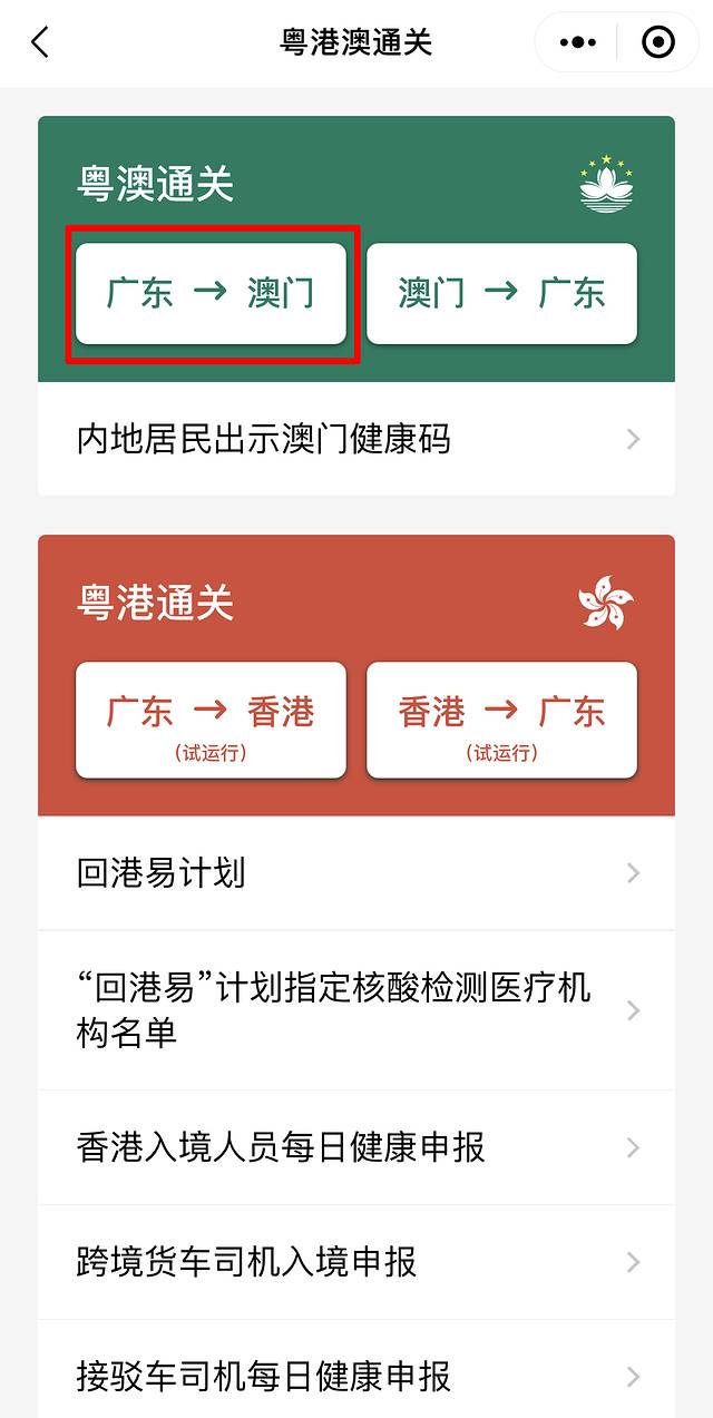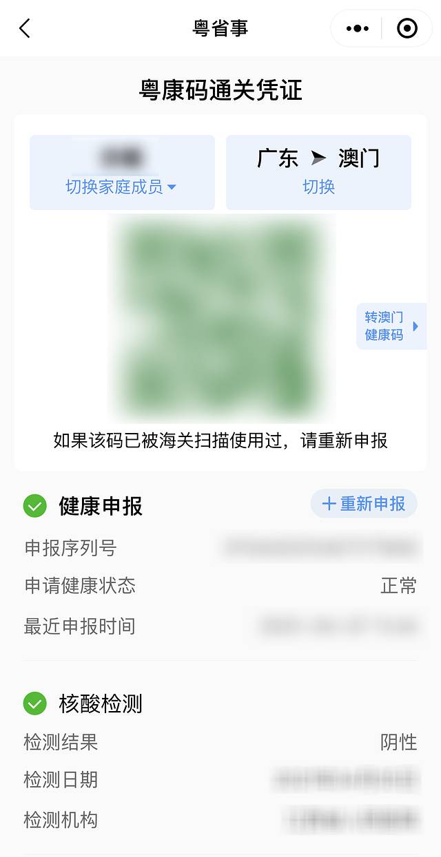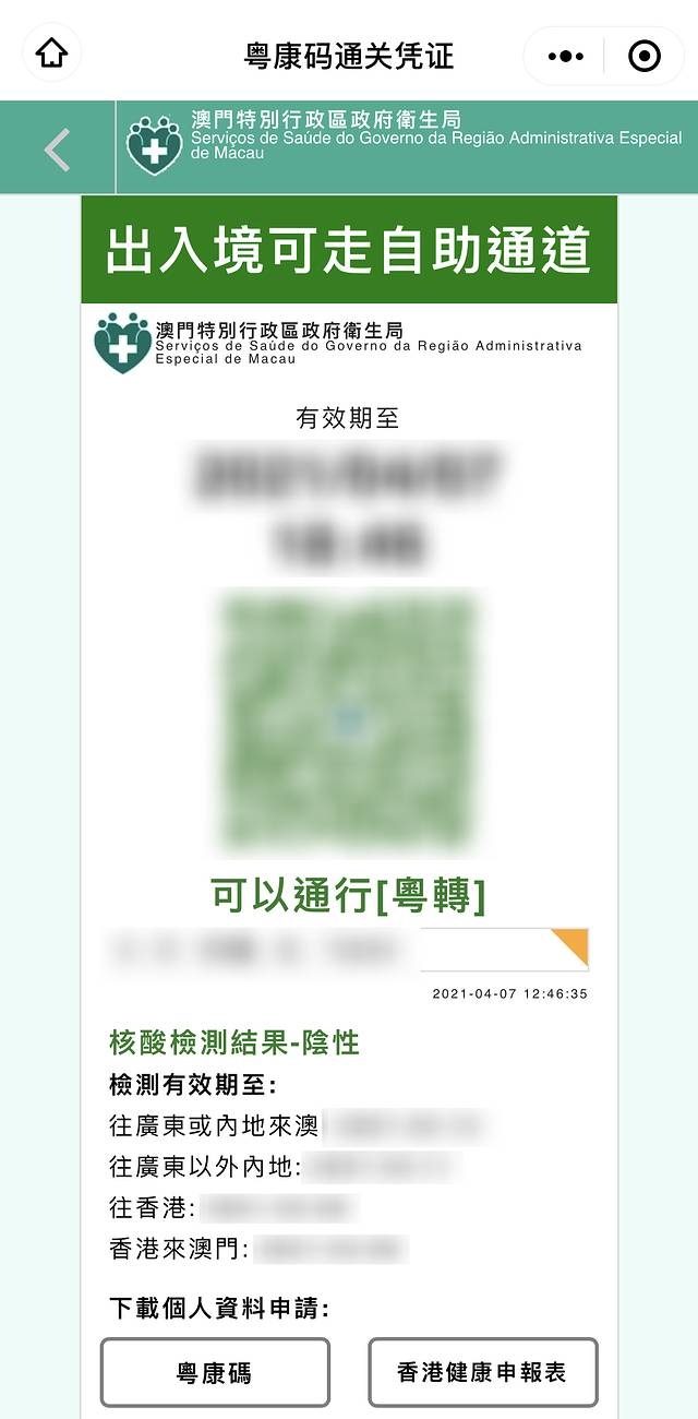 选择广东到澳门,填写相关信息之后,会得到一个绿码。