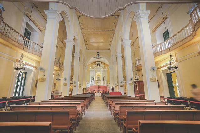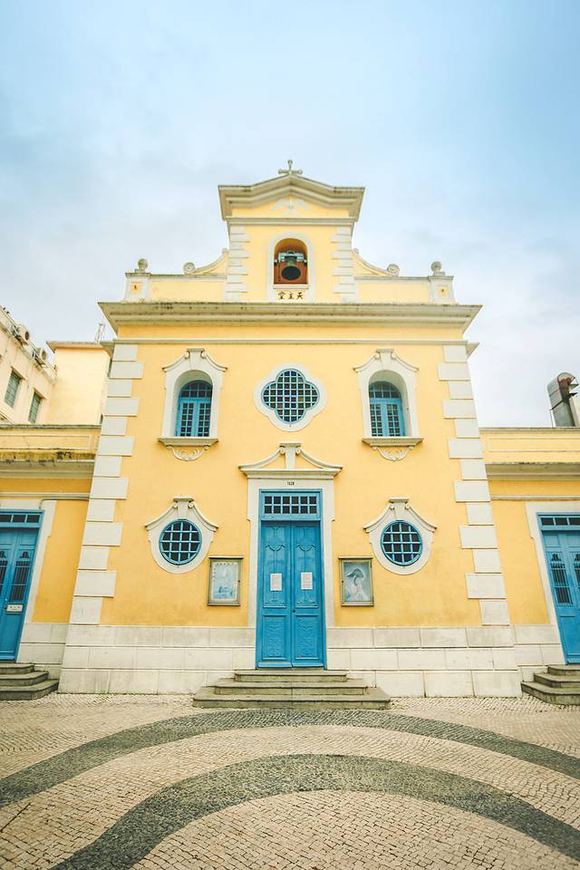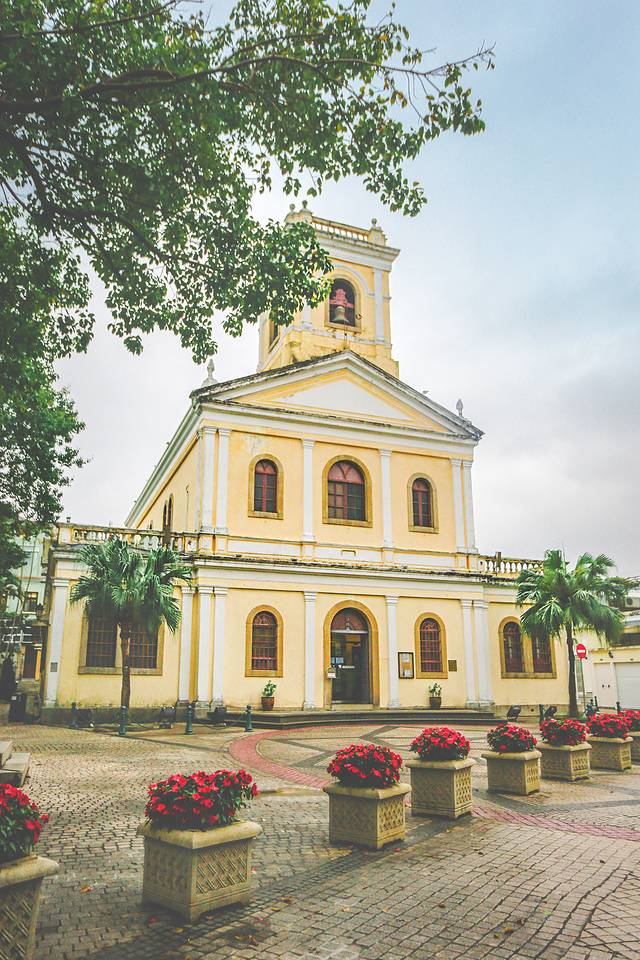 在从议事亭前地步行至大三巴牌坊的路上,很容易地就会邂逅玫瑰圣母堂,一般都不会错过。它是一座亮黄色的欧式建筑,外观十分明艳。只需出示健康码,便可免费进入参观。
