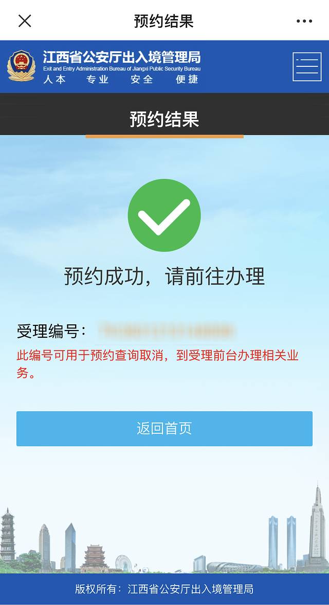 在江西公安出入境GZH预约办理签注,然后在约定的时间到出入境管理局办理。我去的是南昌市公安局出入境接待大厅,位于红谷滩。整个办理流程很简单,取号、填表、缴费,十多二十分钟就搞定了。之后等待一周,就可以去取办好新签注的通行证了。