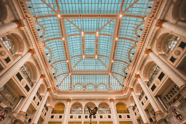 水晶金殿高33米,约10层楼高,挑高的设计令整个大堂有豁然开朗及置身伦敦街头的感觉。这里主要使用玻璃和铁制建造,加入云石铺砌,打造错综复杂的天花,凸显维多利亚时期精湛的建筑风格。