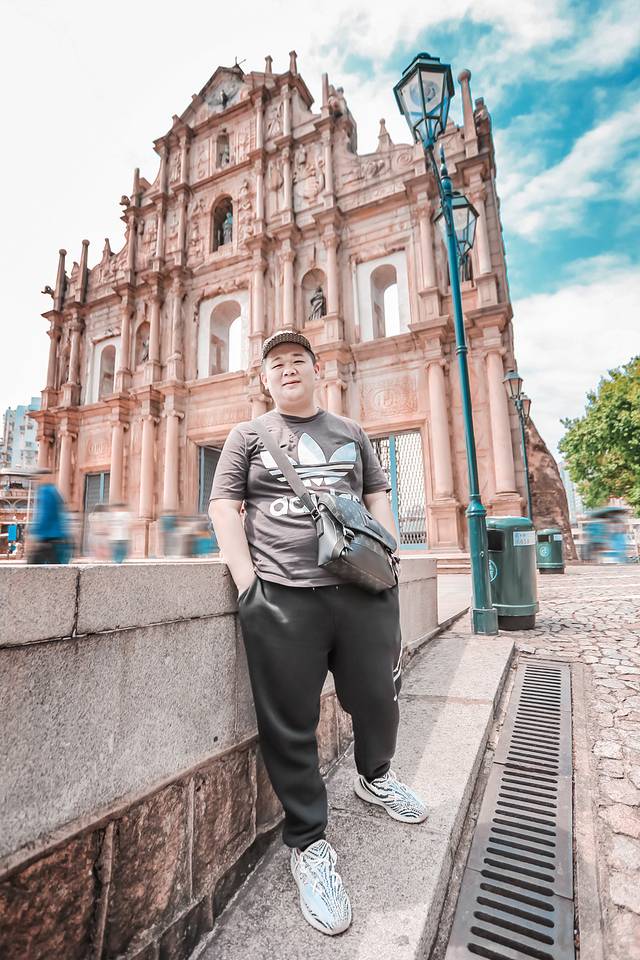 像牌坊侧面的斜坡,就是不错的选择。但我和胖哥找对了位置,却没找对角度,给大家做了一个错误的示范。可以坐在斜坡旁边的青石栏杆上,把拍摄角度放得更低一些,背景就只剩大三巴牌坊,一个游客都拍不到了。