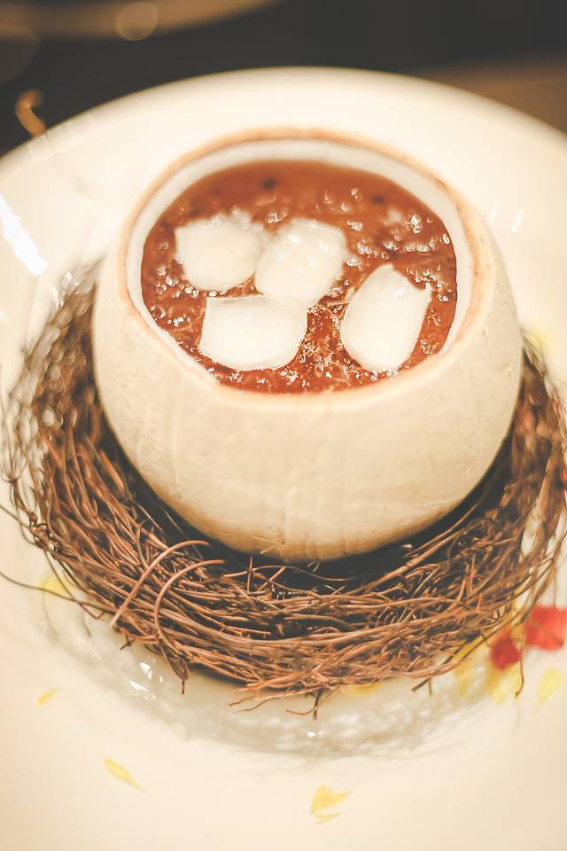 原粒椰盅炖桃胶:不仅味道好,造型更是不错。用椰壳做盛放器皿,放在鸟巢当中,光冲这个颜值都该点了。