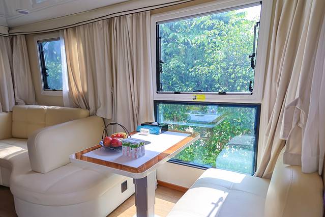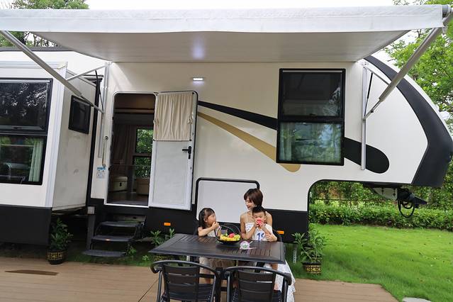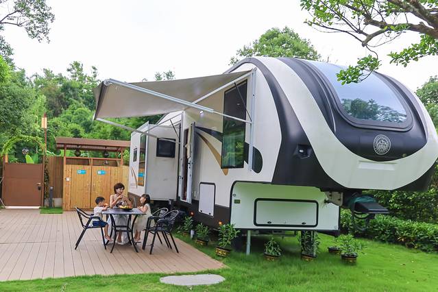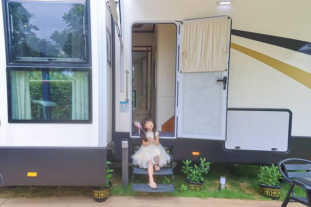 办理入住后,有专属的电瓶车送我们到房车院子,自驾车也可以直接停在入住的房车院子门口。坐在电瓶车上,徐徐微风迎面而来,甚是惬意。