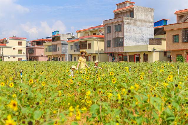 刚刚进到村子这边就看到了村民新种了一大片小菊花,汇成一片黄色的花海!与蓝天,群山相连,小朋友们第一眼看到开心极了,特别是珊珊,女孩子的少女心爆棚了,连着喊叫舅妈快点过来帮我拍照,在这里帮孩子拍一辑美美的写真!