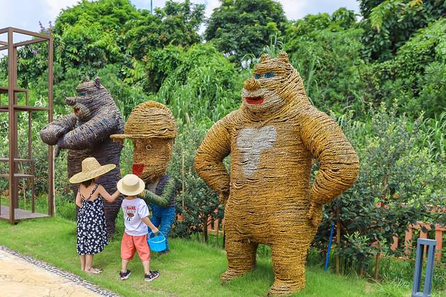 园区内还有还有各种卡通雕塑藏在每个角落,有大有小,十分有趣。门口有提供采摘的大帽檐防晒草帽,提上小花篮一起回味小时候的快乐吧。