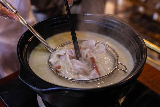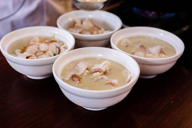 然后大厨会在客人面前把提前熬好的鱼汤煮开,鱼汤奶白,煮开已是香味四溢。放入东星斑鱼片稍微烫熟,然后连鱼汤一起倒入提前放了各种蔬菜的碗中就能上桌。