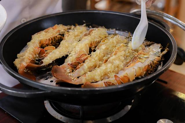 新鲜小青龙开边上桌,铺上蒜蓉,然后放入蒸锅。不得不提的是这里的蒸锅中没有放入水,而是放入了鹅卵石,用鹅卵石蒸,受热更加均匀,而且不会让食物被水蒸气冲淡本来的味道。当鹅卵石烧热后浇入花雕酒,花雕酒的香味瞬间充斥在蒸锅内,花雕酒的香味被小青龙完全吸收,香味非常特别。