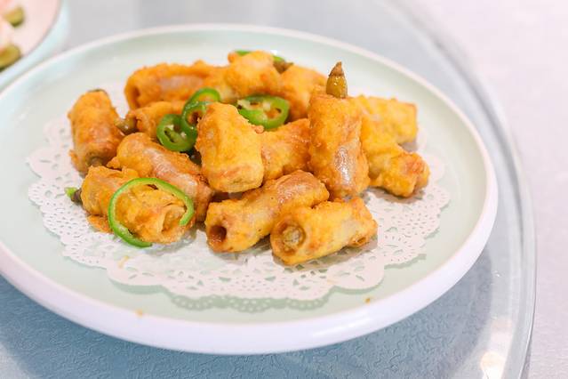 获奖醒神竹肠 竹肠是极好的美食,爽口香脆。用了油炸的方式处理,竹肠更加香口。最特别的是这里在竹肠中放入了泡过的指天椒,酸辣的指天椒能够有效地去掉油炸的些许油腻,更加清爽。而且酸酸辣辣的味道直冲脑门,非常提神。