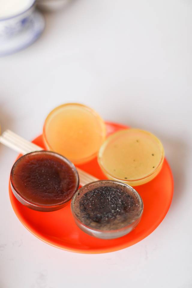 钵仔糕 小时候很喜欢的一道美食。爽口啫喱状的钵仔糕放在小钵中,用竹签挑出食用。这里的钵仔糕加入了不同的水果,味道更加丰富。