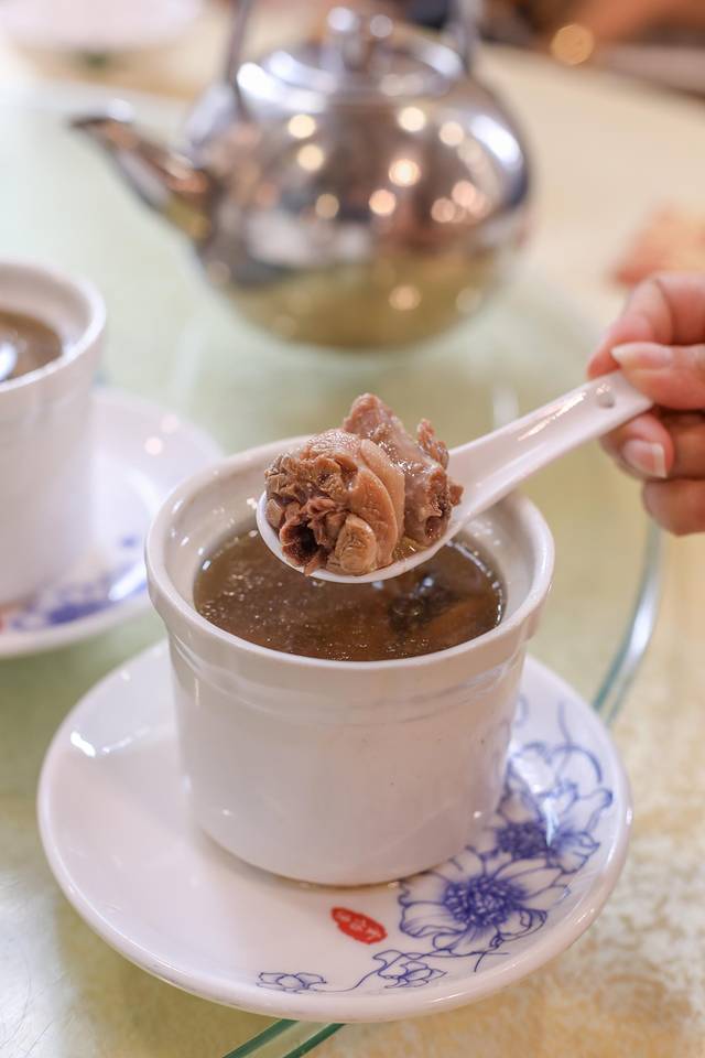 炖汤 广东 人喜欢喝汤众所周知,而清珲酒家的炖汤同样非常出众。小青桔炖肉汁用了瘦肉加上小青桔一起炖制,小青桔有淡淡的清香味道,加上瘦肉的鲜甜,非常清爽
