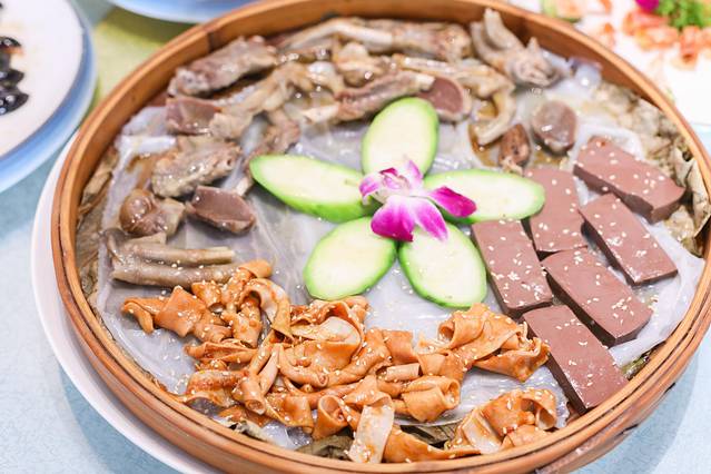 簸箕蒸鹅杂 似乎有骨气颇为喜欢用簸箕作为盛放食材的器皿,很有古色古香的味道。鹅肠爽脆,鹅血软滑,每一种食材都有着独特的口感,在簸箕上蒸熟,简简单单已是非常美味。