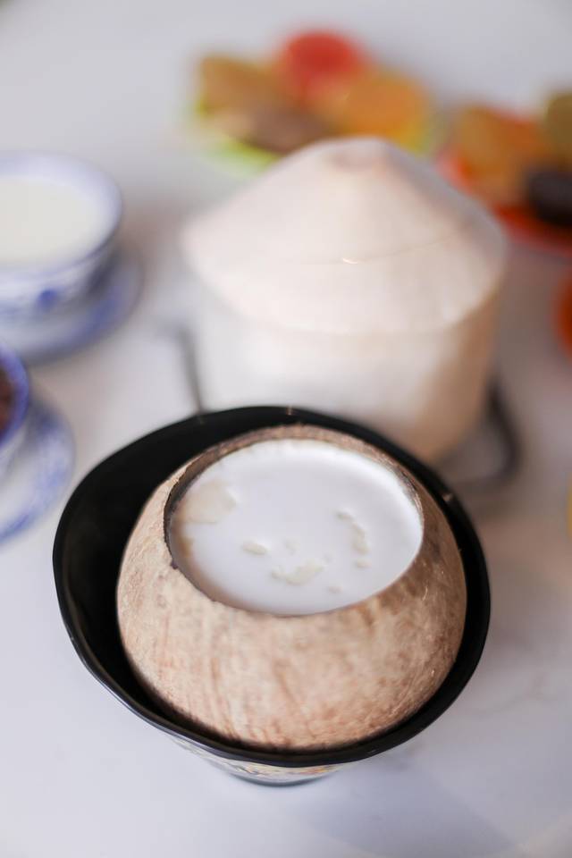 椰子炖水牛奶 水牛奶放入椰子中炖制,牛奶吸收了椰子的清甜味道,更被赋予了不一样的香味。牛奶香滑,经过炖制显得更加浓郁。