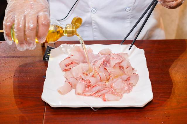 大厨提前把新鲜的东升斑起肉切片,雪白的鱼肉上桌前被摆放整齐,已经是一份精致的艺术品。