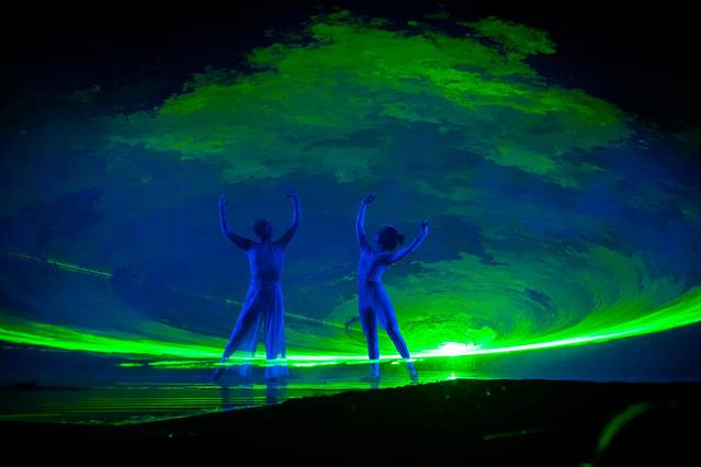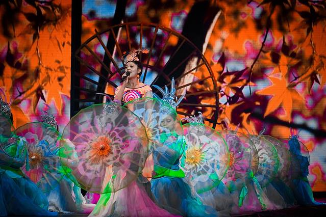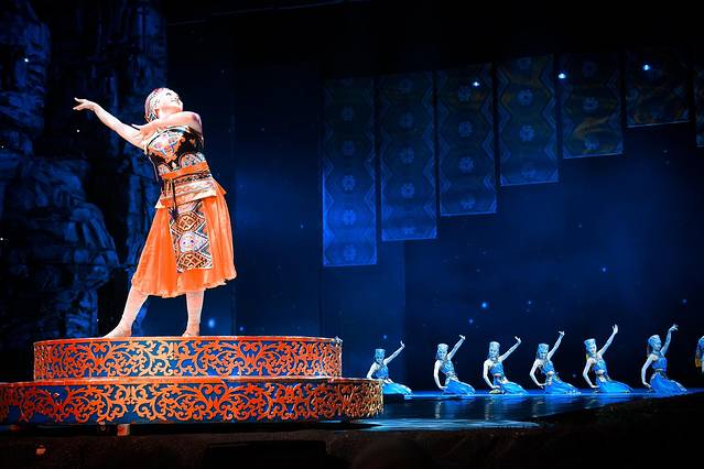 第一场石柱传说画面极妙,少男少女从天而降,舞姿曼妙地演绎着古代重庆万寿山上土家情侣的坚贞爱情,化身石柱,亘古相守的凄美爱情传说和大风堡十二仙峰的神话故事。