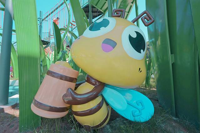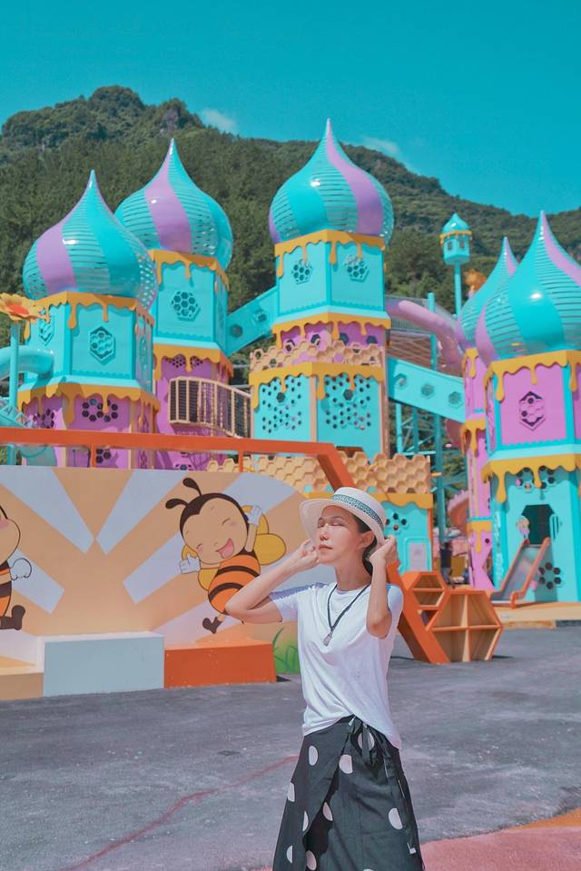 蜜蜂主题乐园才开园不久,设施都很新,我们来到时又刚好遇上大晴天,在阳光在渲染中,整个蜜蜂乐园如动画片中精灵国王宫殿,美得有点不真实。