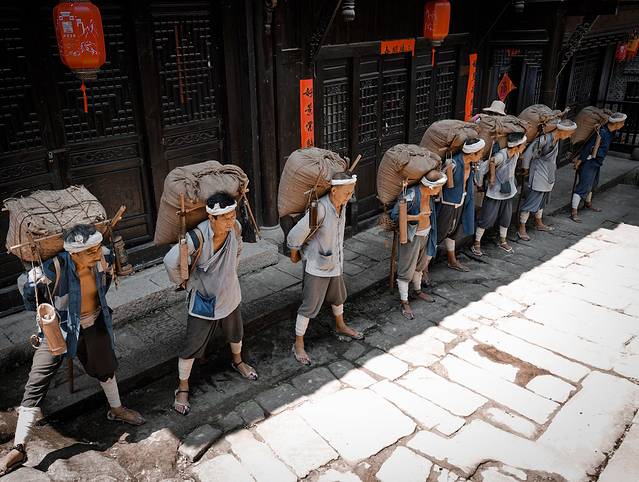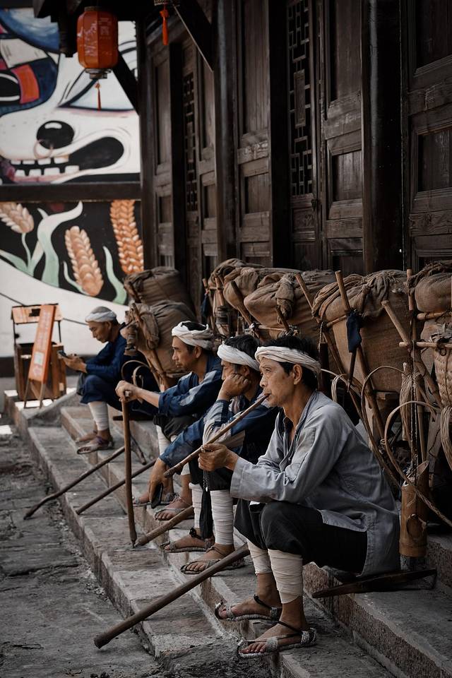 一条长长云梯天街蜿蜒而上,一群巴盐背夫,挑夫,边唱着号子边爬天梯,一幅绝佳人文画卷呈现眼前。古时,隔一段路就有一间幺子店,让力夫们休息,聊天。