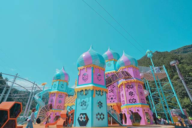 来到石柱中益乡这个蜜蜂主题乐园,可谓非常惊艳了,来前看名字我还以为是卖蜂蜜农产品的地方,来到才知道是游乐园,这座粉粉嫩嫩糖果色的城堡乐园被群山环绕着,让人感觉一下子象进入了童话王国。