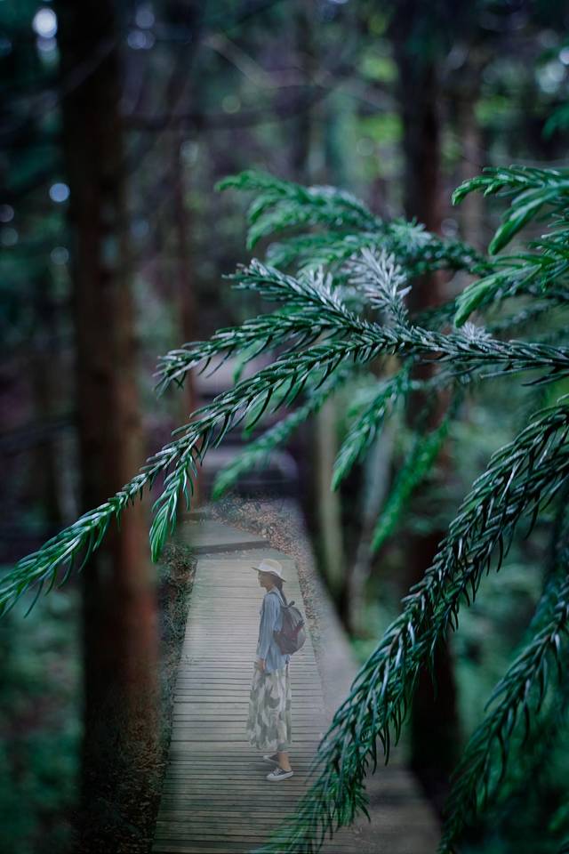在徒步大风堡主线中,只有进山和近山顶处才有观景点,拍人像最佳场景都在上山途中,中途有不少木栈道,可以选一条两旁树木最美的,找个前景,人走在栈道中,对焦前景,人物虚焦,特别美。