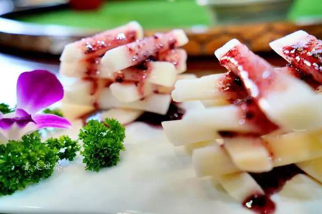 这道精美的素菜不一定是内蒙特产,但也不多见,口感酸甜的蓝莓酱拌上入口即化的铁棍山药,此菜不仅颜值高,而且对女孩子而言也是美容胜品,山药健脾益气,但要做得好吃也很考究功夫.