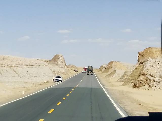 两边满满的都是风蚀地貌,形态各异。表层白色的物体,猜测是盐。