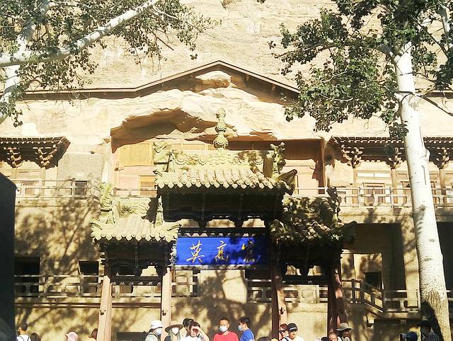 在全国各地看过不少的寺庙、佛像,在莫高窟却是彩色的壁画、高大的彩色佛像。进到窟内满满的四周都是彩色的壁画,佛像、供养人画像、侍女图等等形态各异、色彩鲜艳、多层叠加,九层楼高的弥勒佛像站在脚下仰望满是“哇哦”这么高大、漂亮。有一个洞窟四周绘满画像,每一面墙壁是一类人物,整个穹顶铺满半身佛像,真的是还没看够就要走出来了(由于人多,不让停留,从进窟观赏就要一直慢步走动)。