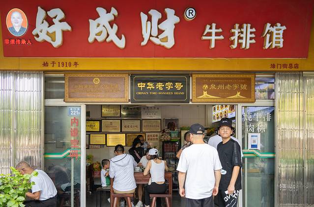 泉州人对牛肉的热爱程度从遍布街头巷尾的牛肉店就可以看出来了,好成财牛排馆有着一百多年的历史了,在泉州早已家喻户晓,也成了游客必打卡的一处美食,位置也特别好,就在清净寺对面。