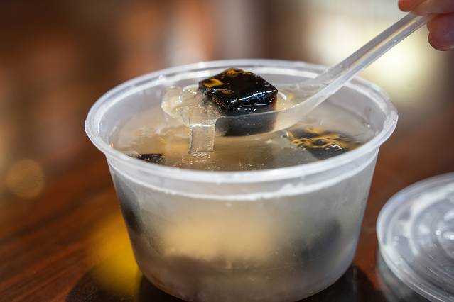 天后宫旁的“秉正堂石花膏”总店成了游客以及当地人的心头爱,店里总是门庭若市,前来品尝石花膏的客人络绎不绝,秉正堂的石花膏脆而滑嫩,食之清凉润肺、解暑去燥,放在四果汤内才是绝配。