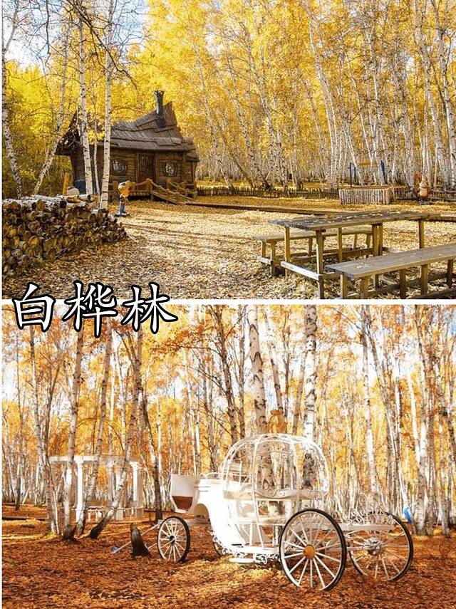 秋季的白桦林,一进入就有一股浓浓的童话风扑面而来。美丽的南瓜车,玻璃栈道,熊出没的小屋