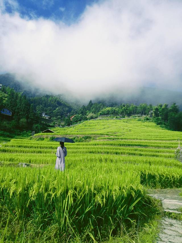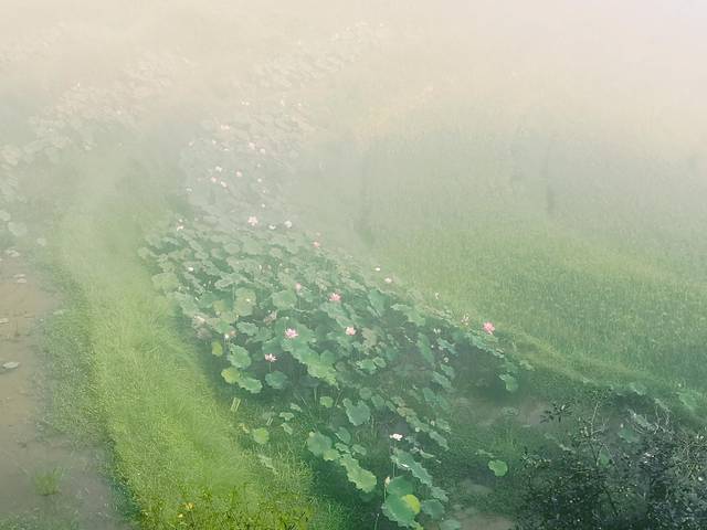 看日出的地方,远山,云像一锅热汤在煮,宽阔且高远,山海不分,容纳万分。近邻,梯田成片,稻谷成穗,野花缀满小道,荷花相映成趣,迷雾聚散起伏,多有浸在水潭里的错觉,很有意思。在这里还看到了很美的卫生间,也算十足的用心了。
