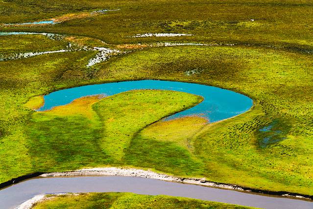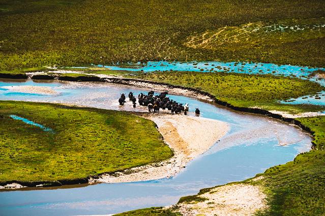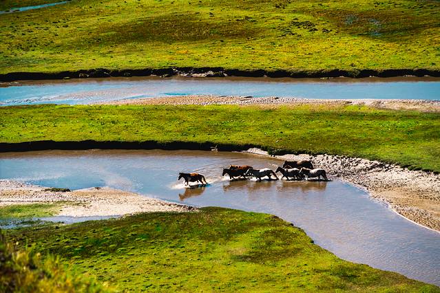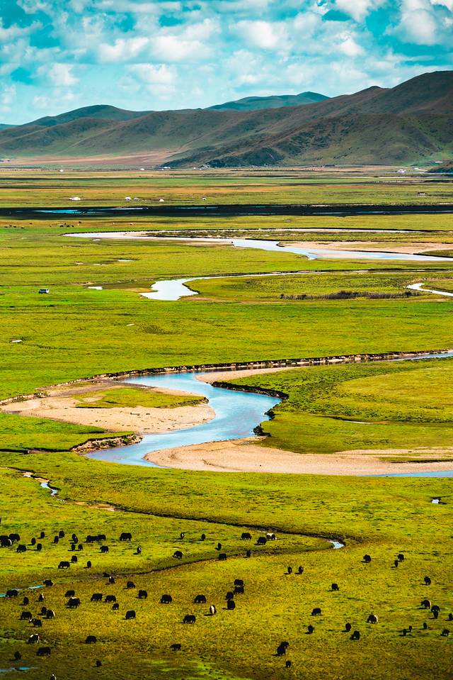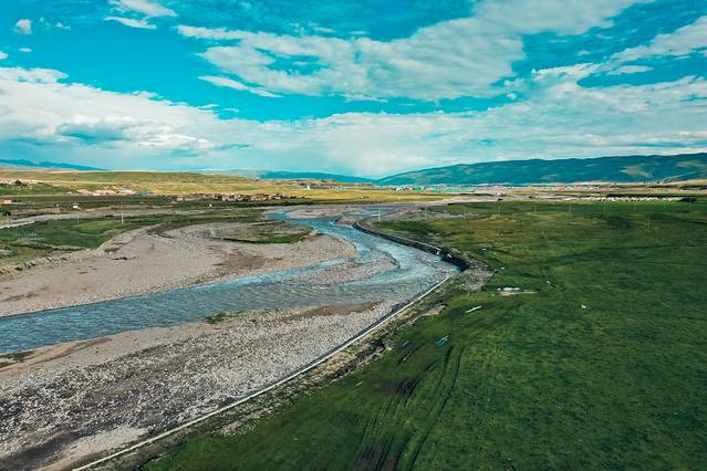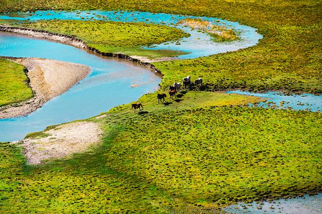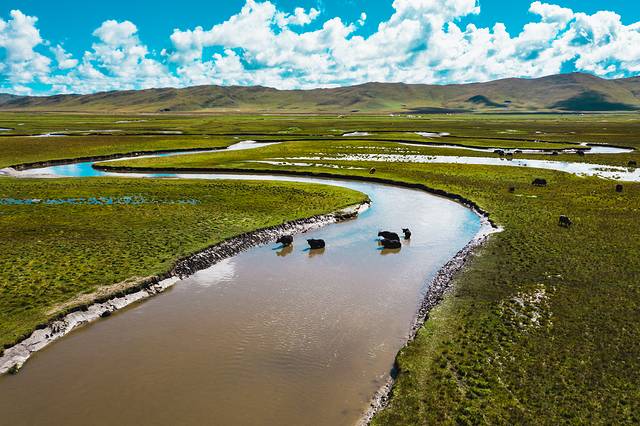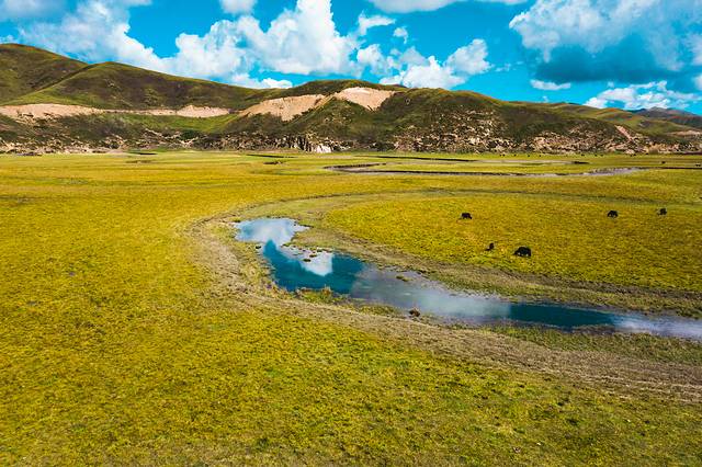 漫泽塘湿地是长江、黄河重要水源涵养地和生态功能保护区,有着“地球之肾”的美誉。青青牧草犹如一块巨大的“绿毯”,牦牛、骏马、羊群悠闲地在花草间踱着步、吃着草;一簇簇盛开的格桑花,在阳光下分外妖娆。绿草如茵的漫泽塘湿地上,还有一条蜿蜒曲折的河流,河水静静地流淌,倒映着蓝天白云,远远望去,犹如一条缠绕在这片美丽草原上的项链。