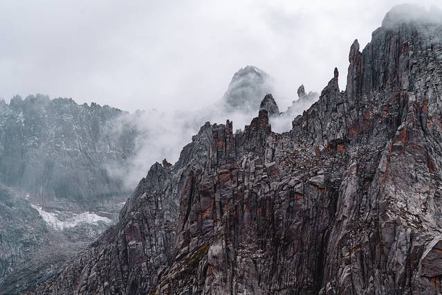 看山看的是形。这次来到莲宝叶则,与雨雪相逢,那些晴日里形神兼俱的山石,云海缥缈间,将军岩、忏悔崖、骆驼峰、狮身人面像、一吻千年、八戒悟道、千仞壁、鹰击长空、南天门、莲宝峰、飞来石、金山银池……似乎也多了羞赧,变得灵动而妩媚。