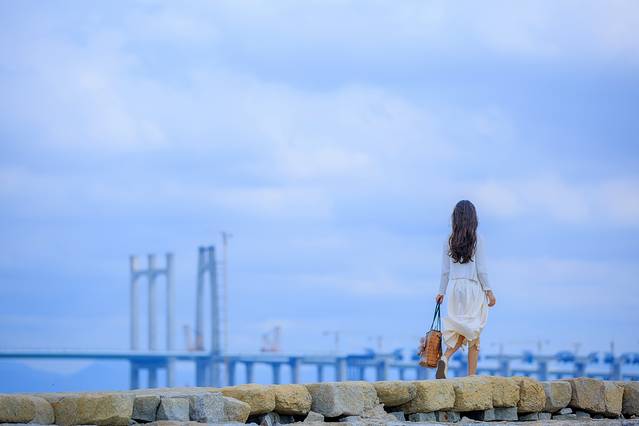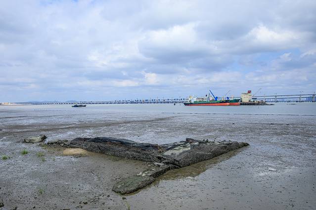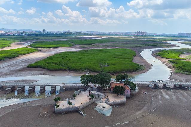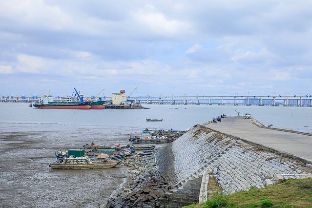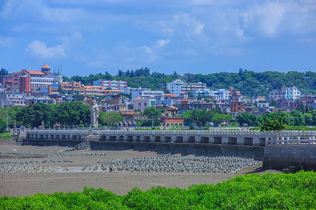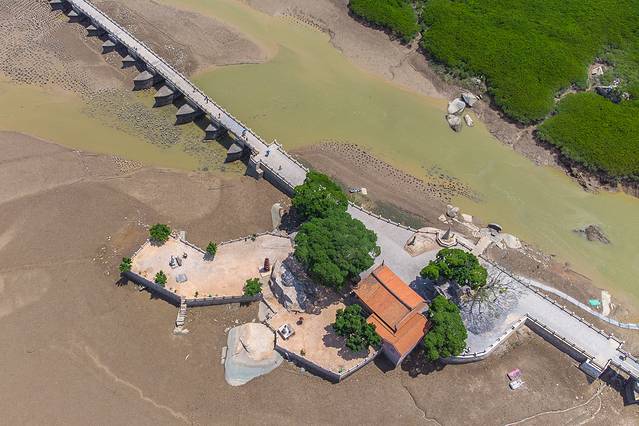 长长的桥面由长石板纵横铺就,船形桥墩由石块堆砌而成。桥下滩涂上有很多渔民用水泥板搭成的三角架,听说是用来养海蛎的,初一十五涨潮时,就会有海蛎附着上面生长。