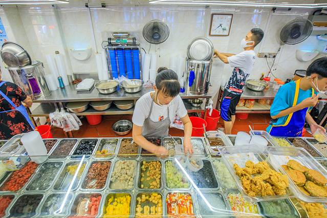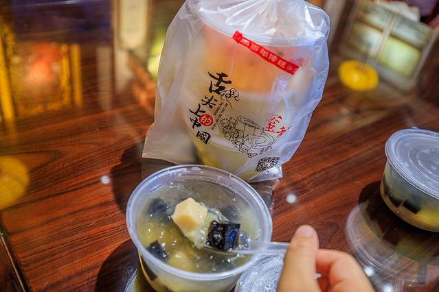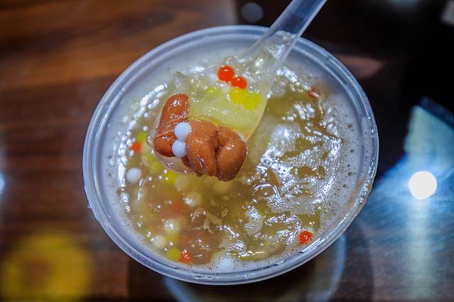 招牌四果汤,除了必点的石花条,还可从一二十种配料中自选四种配料,有红豆、芋头、椰果、布丁、水果、芋圆、珍珠、仙草蜜等等。挑好配料,浇上蜂蜜,加点冰水,炎热的夏季来上一碗,绝对是消暑的不二之选,如此受欢迎想必你也能理解了!